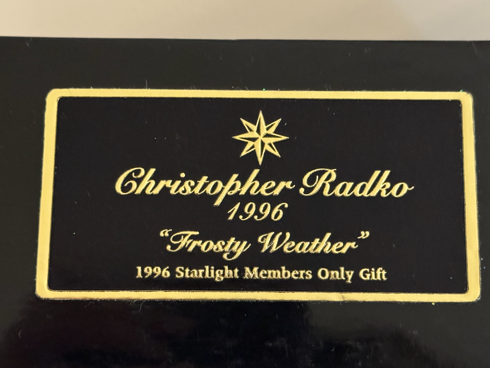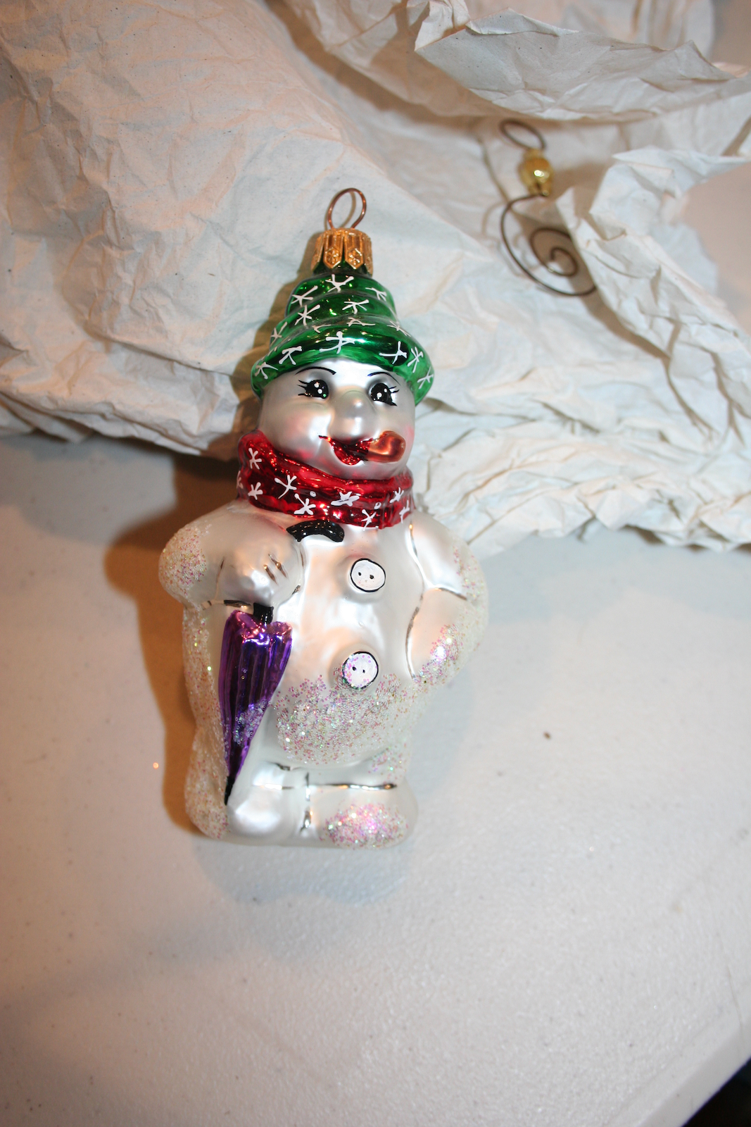 Christopher Radko “Frosty Weather” — 1996 Starlight Members Only Gift. Glass blown snowman with green hat, red scarf, and purple umbrella.