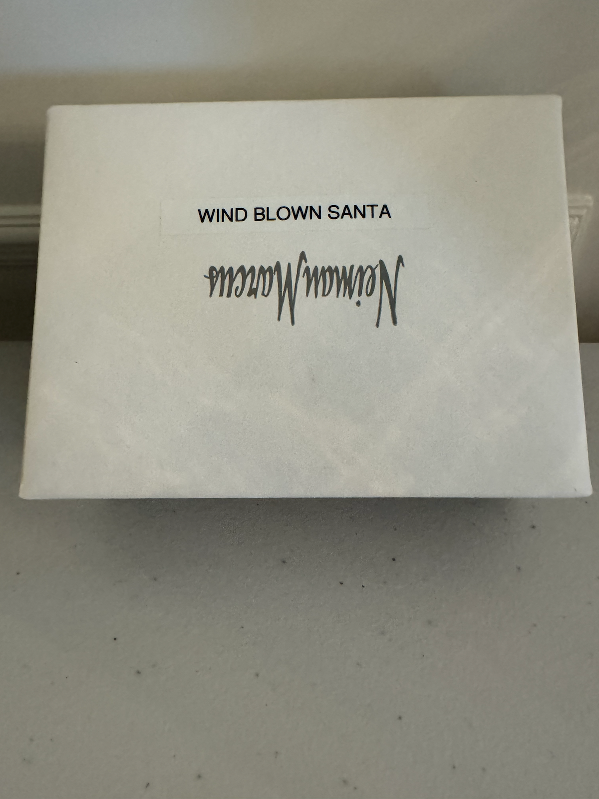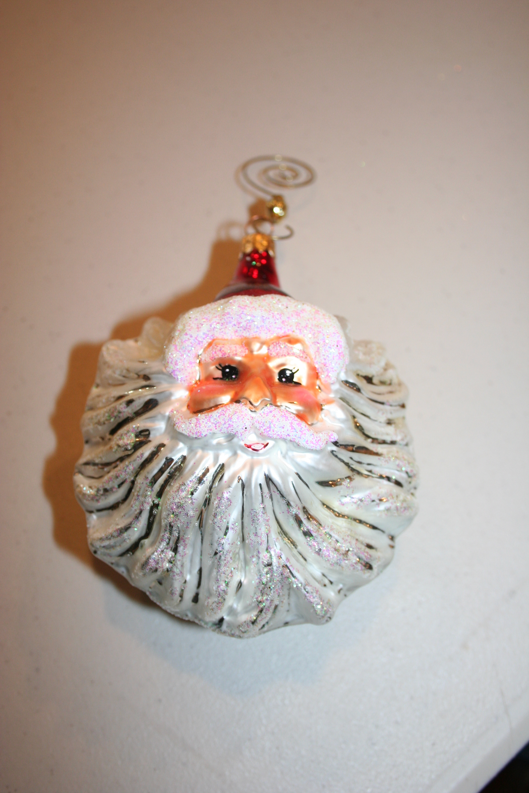 “Wind Blown Santa” ornament from Neiman Marcus. Glass blown Santa face with a large, flowing silver beard and glitter accents.