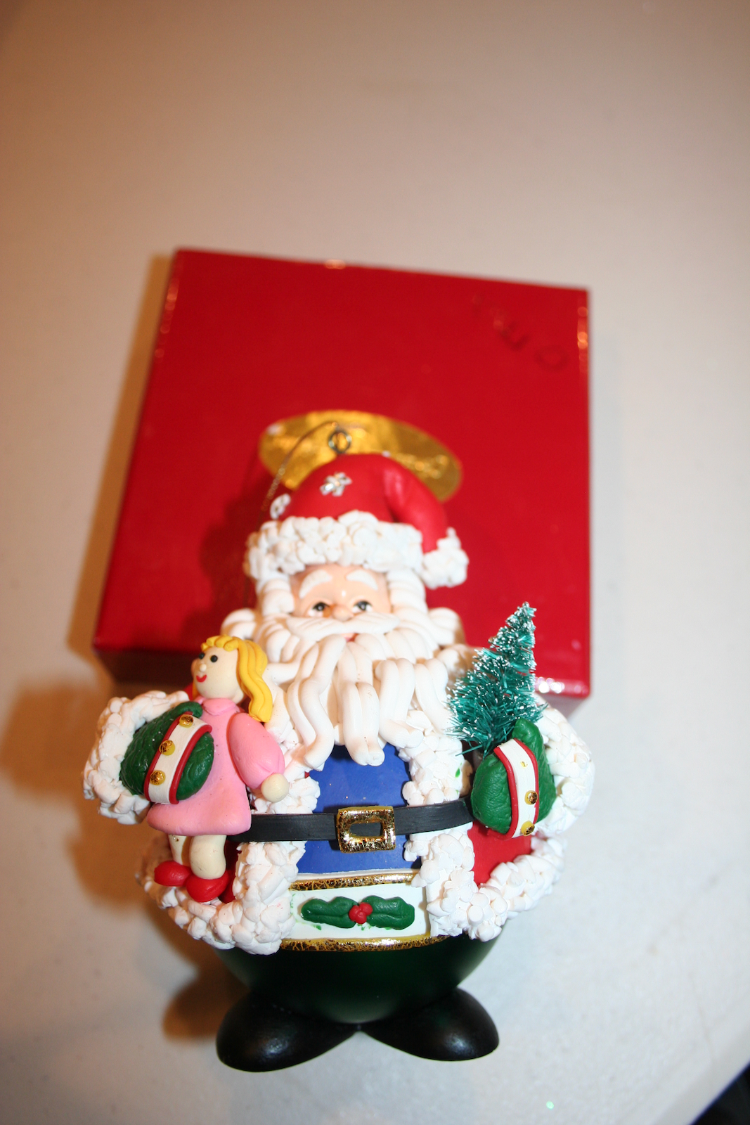 Ceramic Santa figure holding a doll, small Christmas tree, and candy cane. From the Whimsy Christmas Collectibles line.