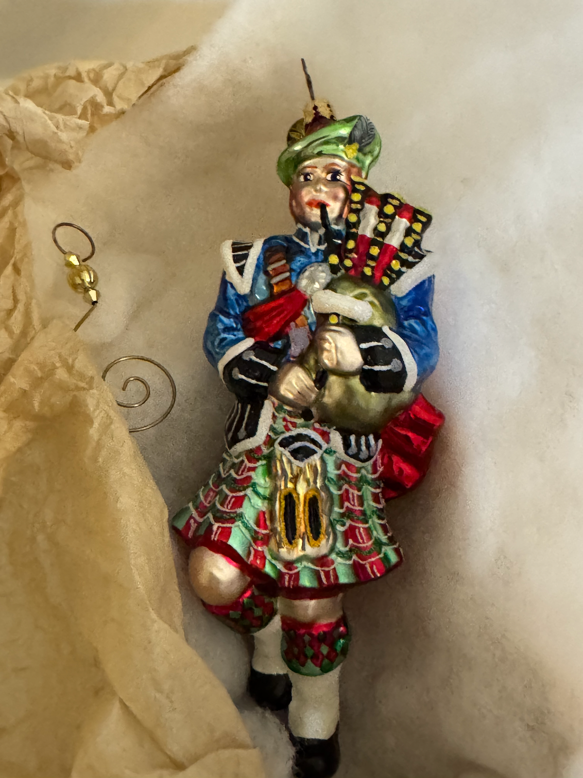 A Christopher Radko glass ornament from the Twelve Days of Christmas Series, limited to 10,000 pieces. This ornament depicts a Scottish piper in traditional Highland dress with bagpipes and kilt, representing “Eleven Pipers Piping.”