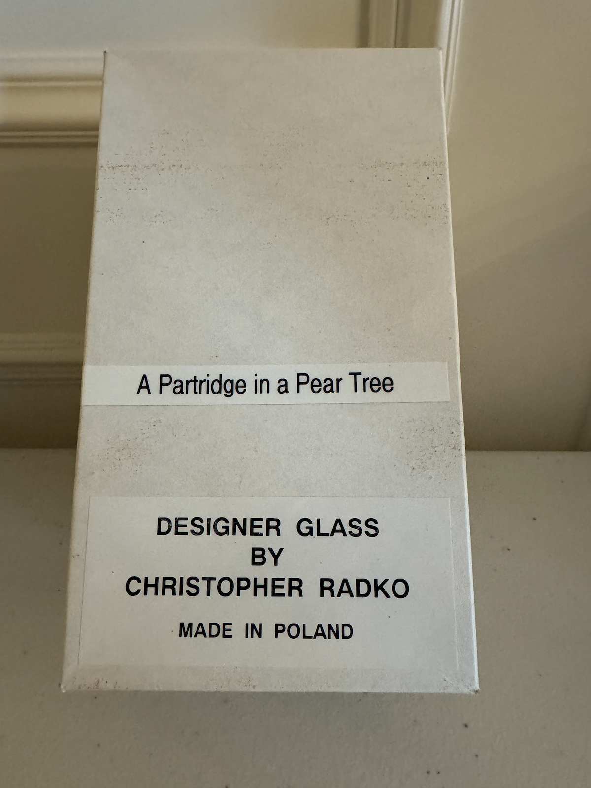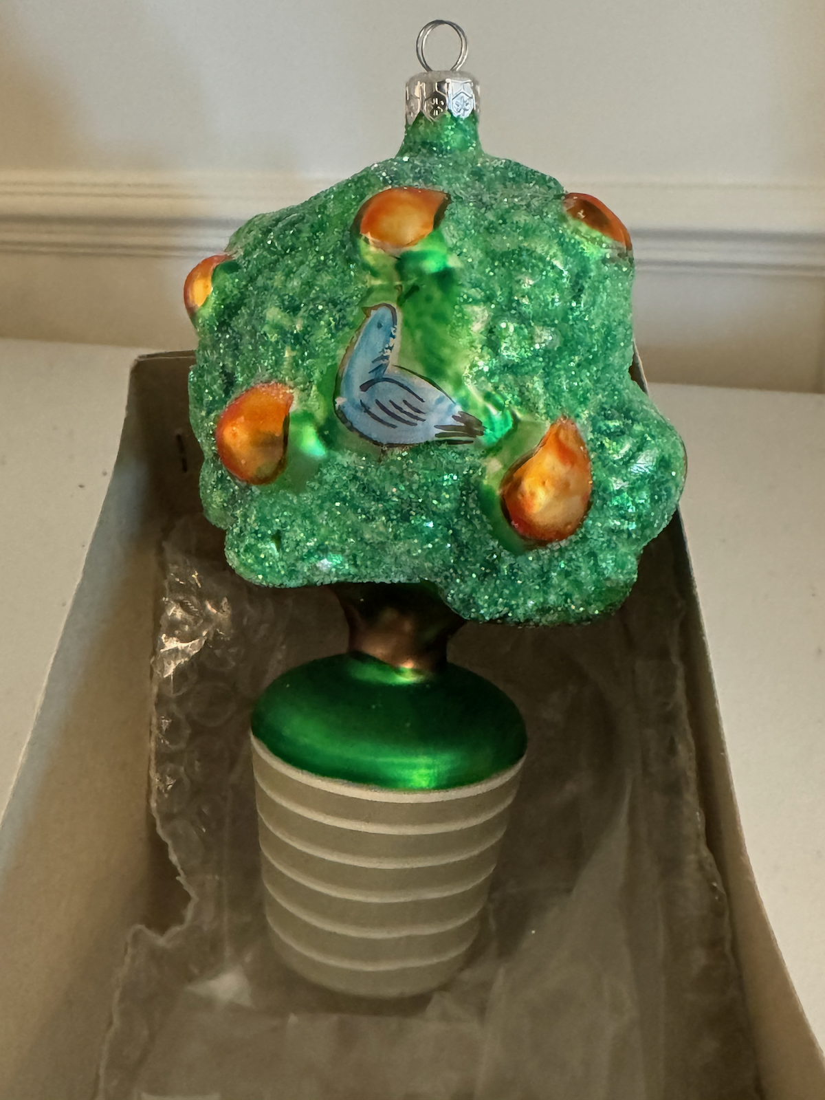 Part of Christopher Radko’s Twelve Days of Christmas collection. This is one of the earlier pieces, packaged in the original white Designer Glass box rather than the later black limited-edition boxes.