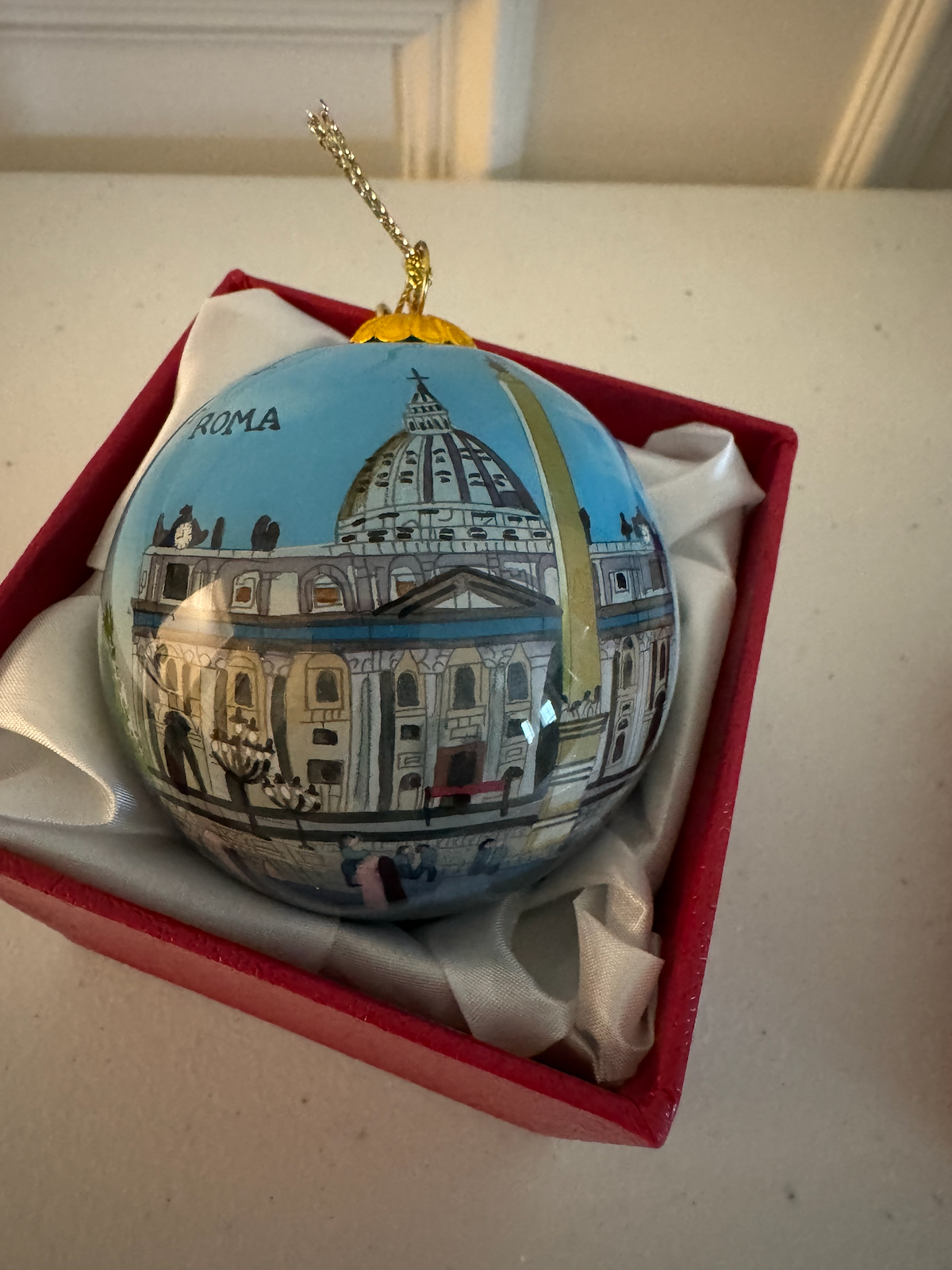 A travel souvenir ornament from Rome, Italy. Only one photo exists showing the item in its red display box.