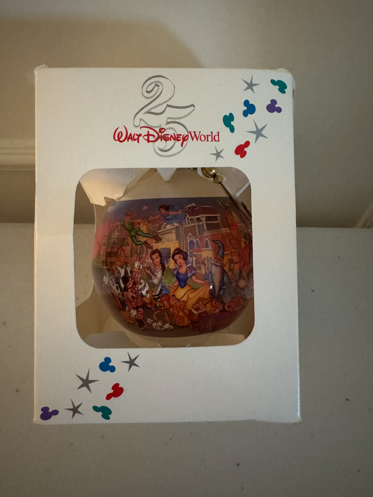 Walt Disney World’s 25th anniversary was celebrated in 1996-1997. This ornament commemorates that milestone. Only one photo exists showing the ornament in its original packaging.
