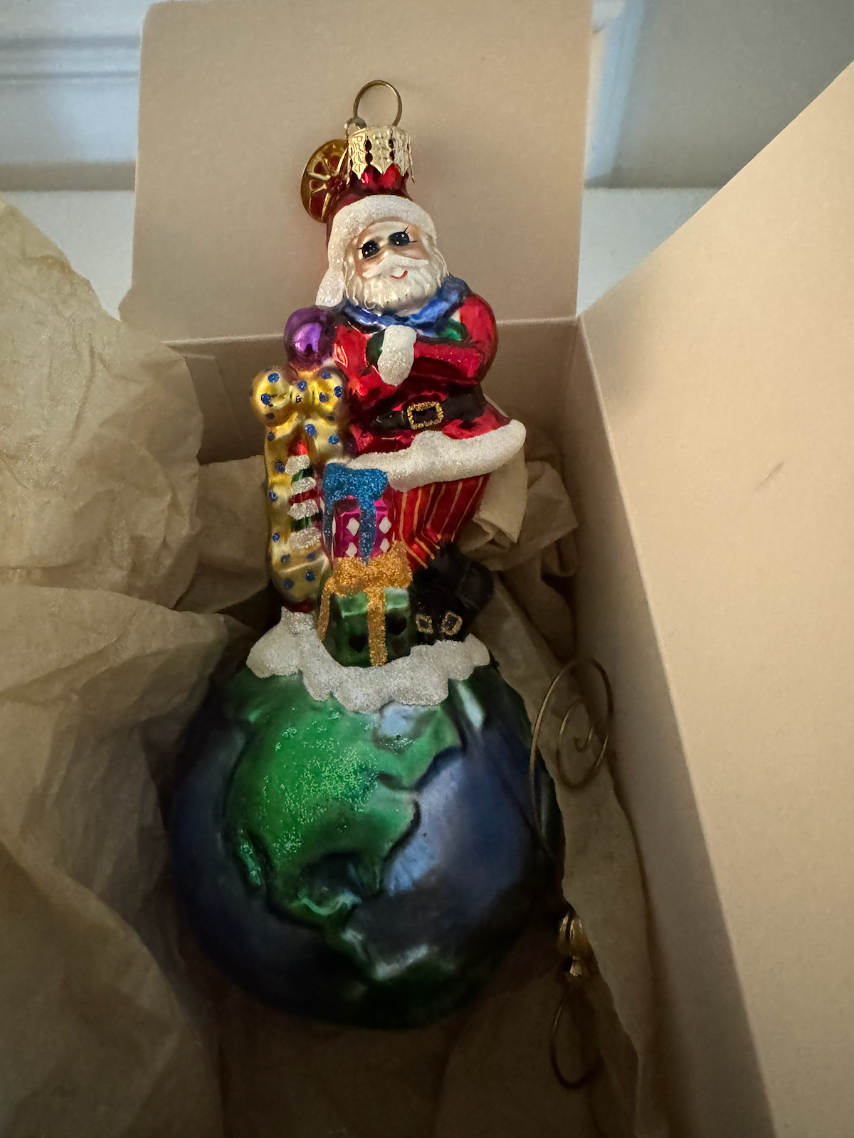 Christopher Radko “On Top of the World” glass ornament from 2004. Features Santa Claus sitting atop a globe (Earth), surrounded by presents, candy canes, and toys. Santa wears his traditional red suit and holds a bag of gifts while perched on the blue and green world below.