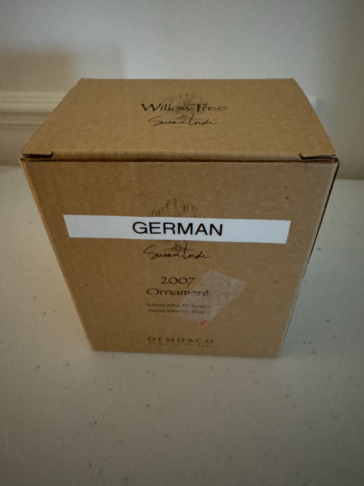 Labeled “German” on the Willow Tree box, dated 2007. This appears to be a German-themed holiday ornament, possibly referencing German Village or a German Christmas market scene.