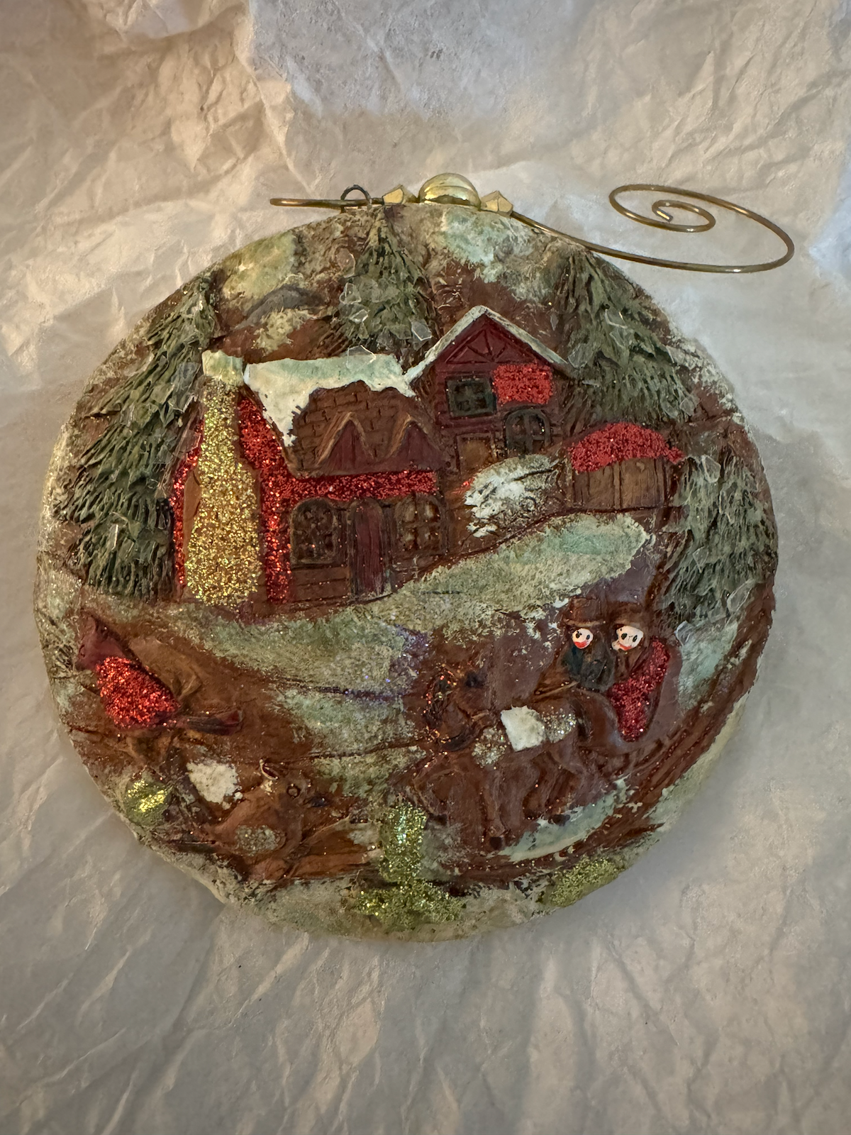 A Willow Tree by Susan Lordi ornament from 2007 by Demdaco, labeled “German.” The ornament is a round disc-style piece featuring a three-dimensional winter village scene with glittered houses, pine trees, and a figure in a sleigh on a snowy path. Rich textural details with red and gold glitter accents.