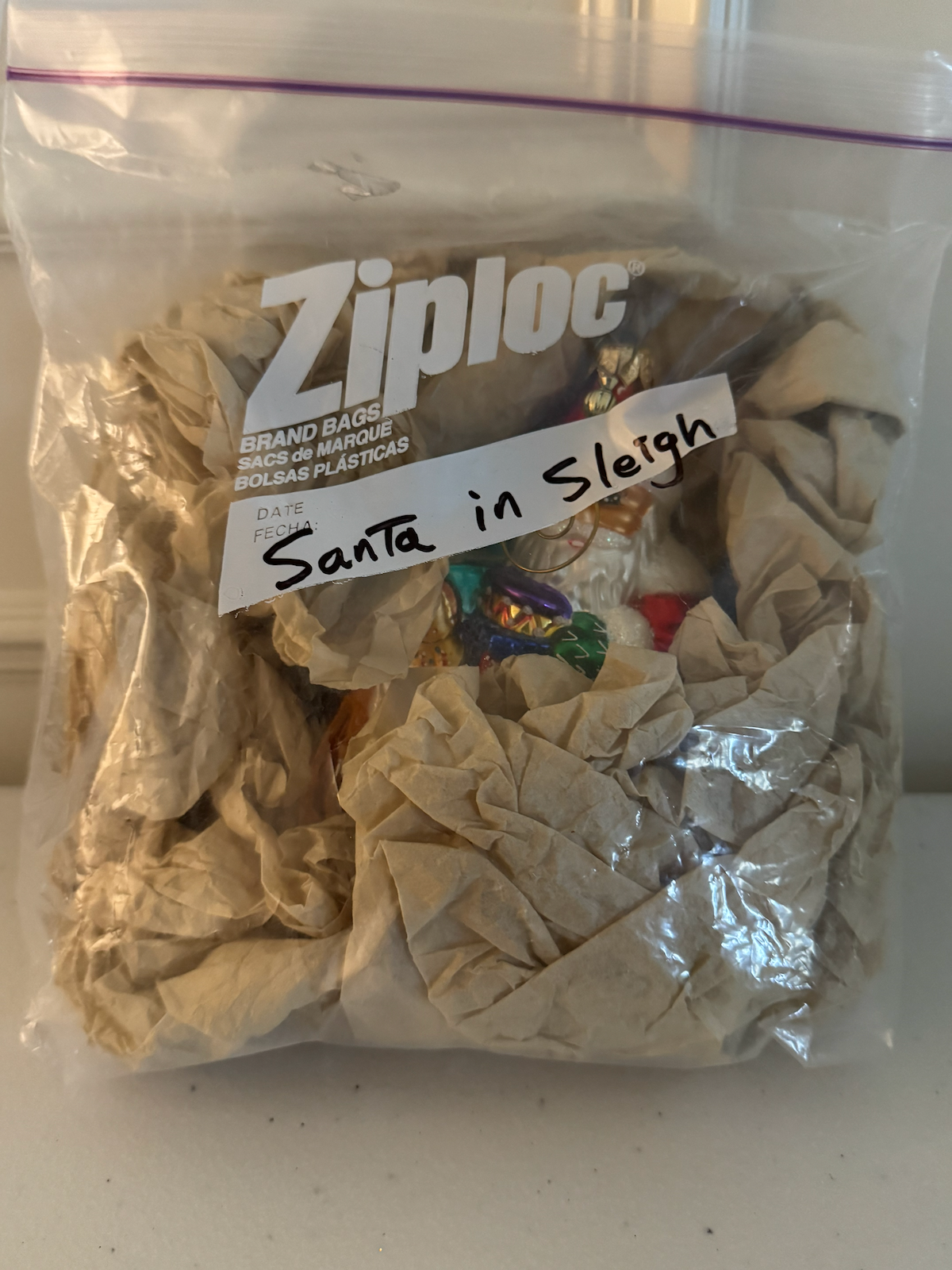 Stored in a Ziploc bag labeled “Santa in Sleigh.”