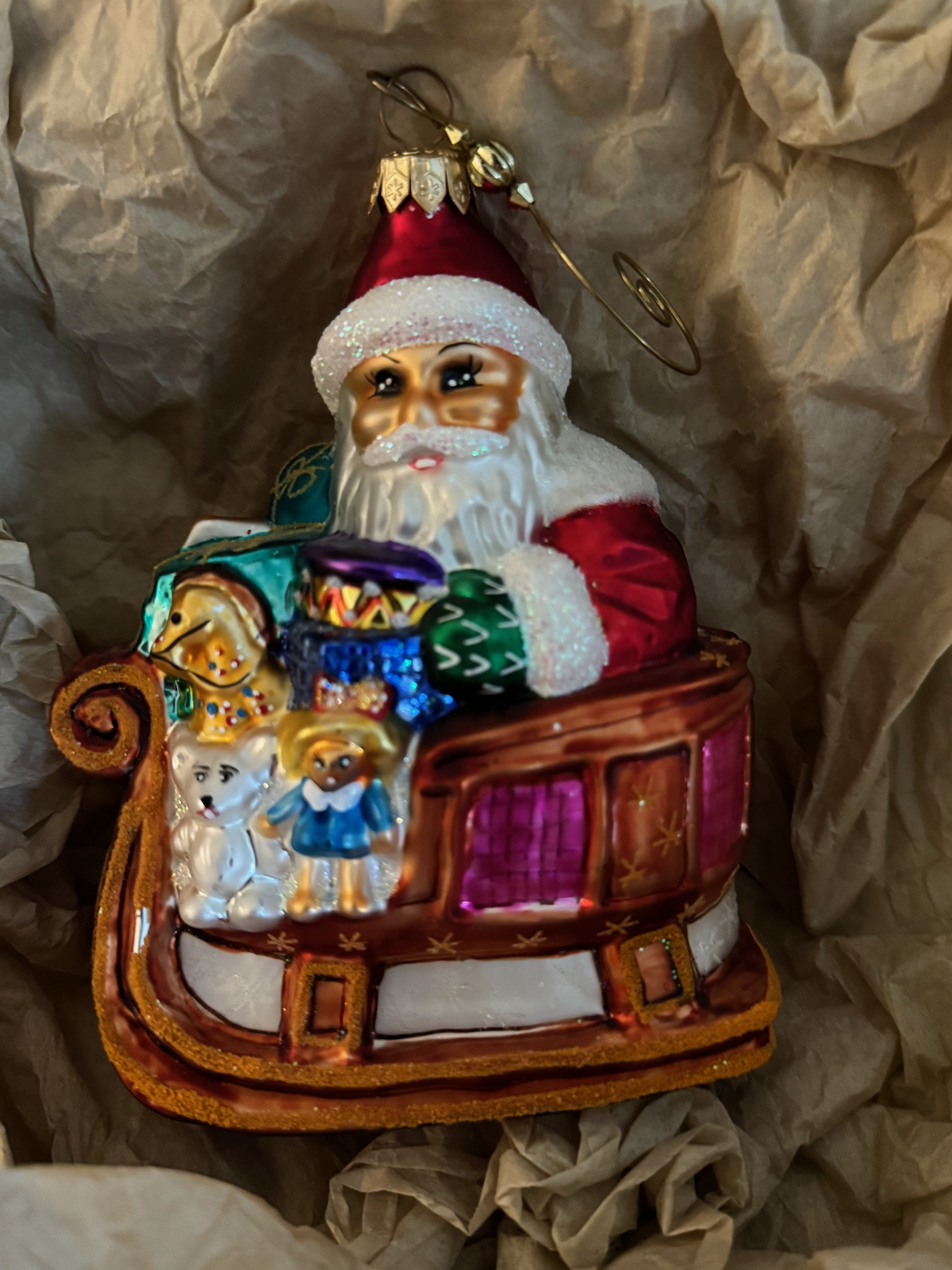 A blown glass Santa in Sleigh ornament. Features Santa Claus seated in a brown wooden sleigh filled with toys and gifts, including a doll, teddy bear, drum, and other colorful packages. Santa has a detailed face with glittered white beard and red hat. The sleigh has gold star decorations and curled runners.