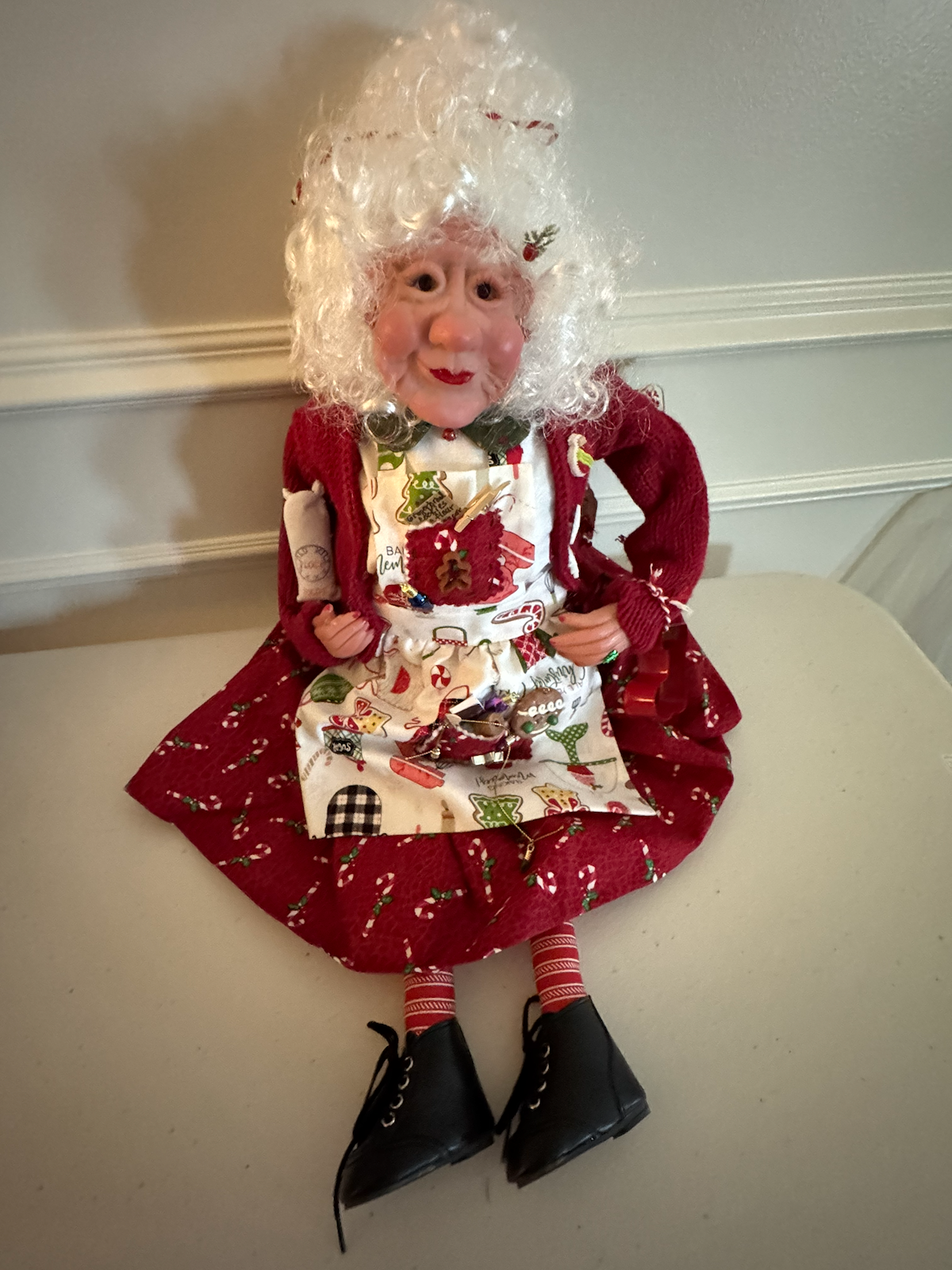 A large decorative sitting Mrs. Claus figurine. She wears a red dress with white polka dots (candy canes), a red cardigan sweater, and a Christmas-themed apron with holiday prints. She has curly white hair, rosy cheeks, and holds a small note or recipe card. Her stockings are red and white striped, and she wears black lace-up boots. The figurine is designed to sit on a shelf or mantel with legs hanging over the edge.