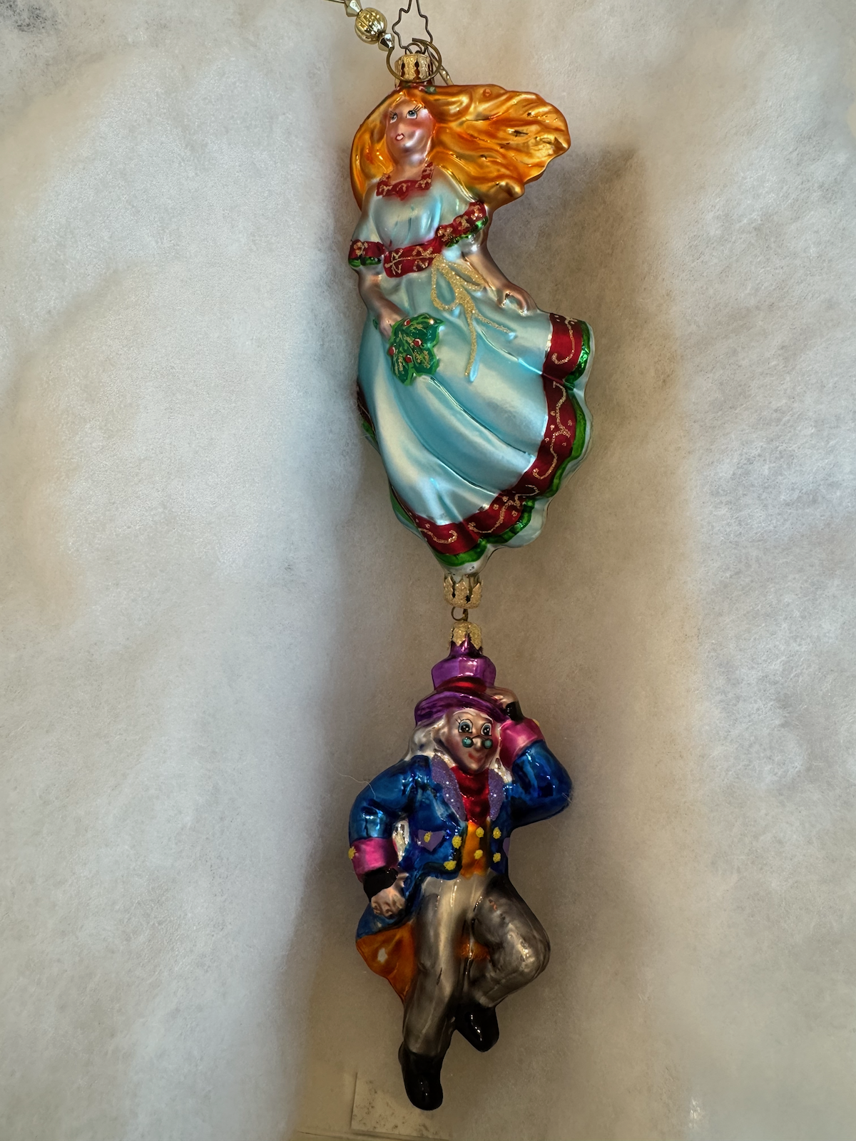 Christopher Radko “Ghost of Christmas Past” blown glass ornament. This two-piece dangling ornament features the ethereal Ghost of Christmas Past as a flowing female figure in a light blue gown with red trim and golden hair, connected by a chain to a smaller figure of the young Ebenezer Scrooge in a colorful Victorian outfit.