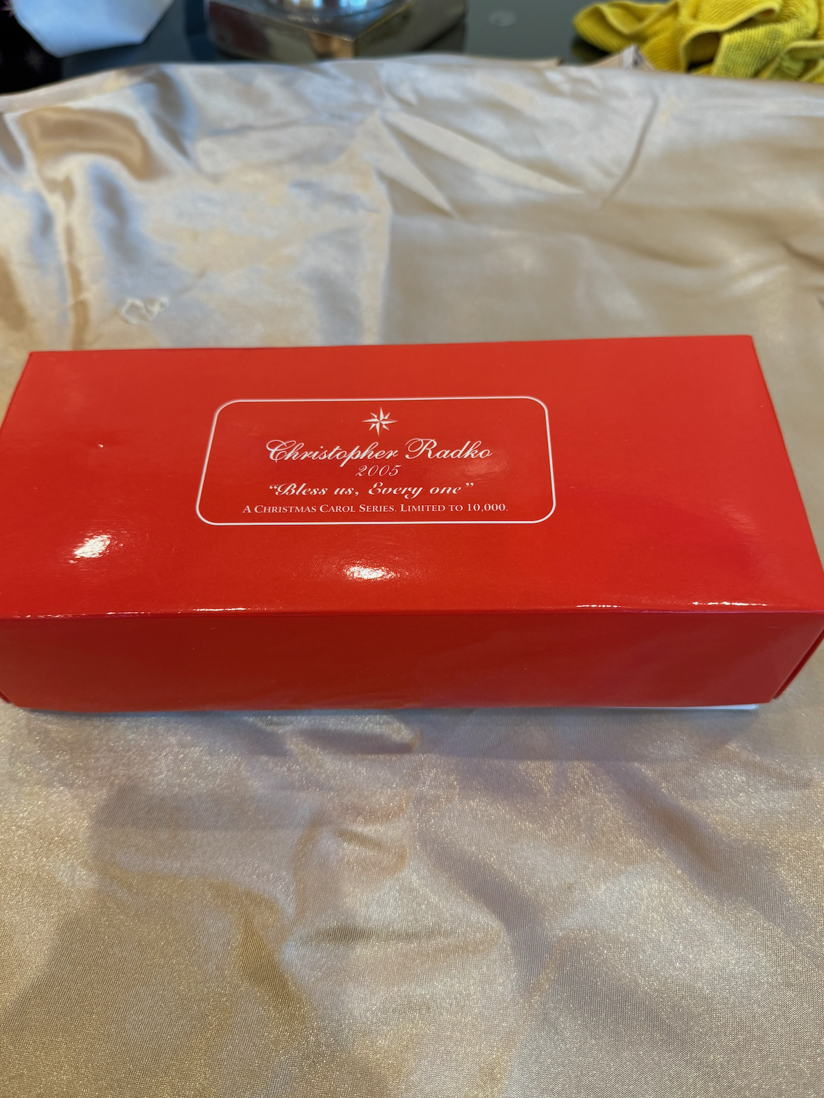 Part of Christopher Radko’s A Christmas Carol limited edition series. The title references Tiny Tim’s famous blessing, “God bless us, every one!” This ornament likely represents the final piece or one of the later entries in the series depicting the Cratchit family or townspeople celebrating a redeemed Scrooge’s generosity.