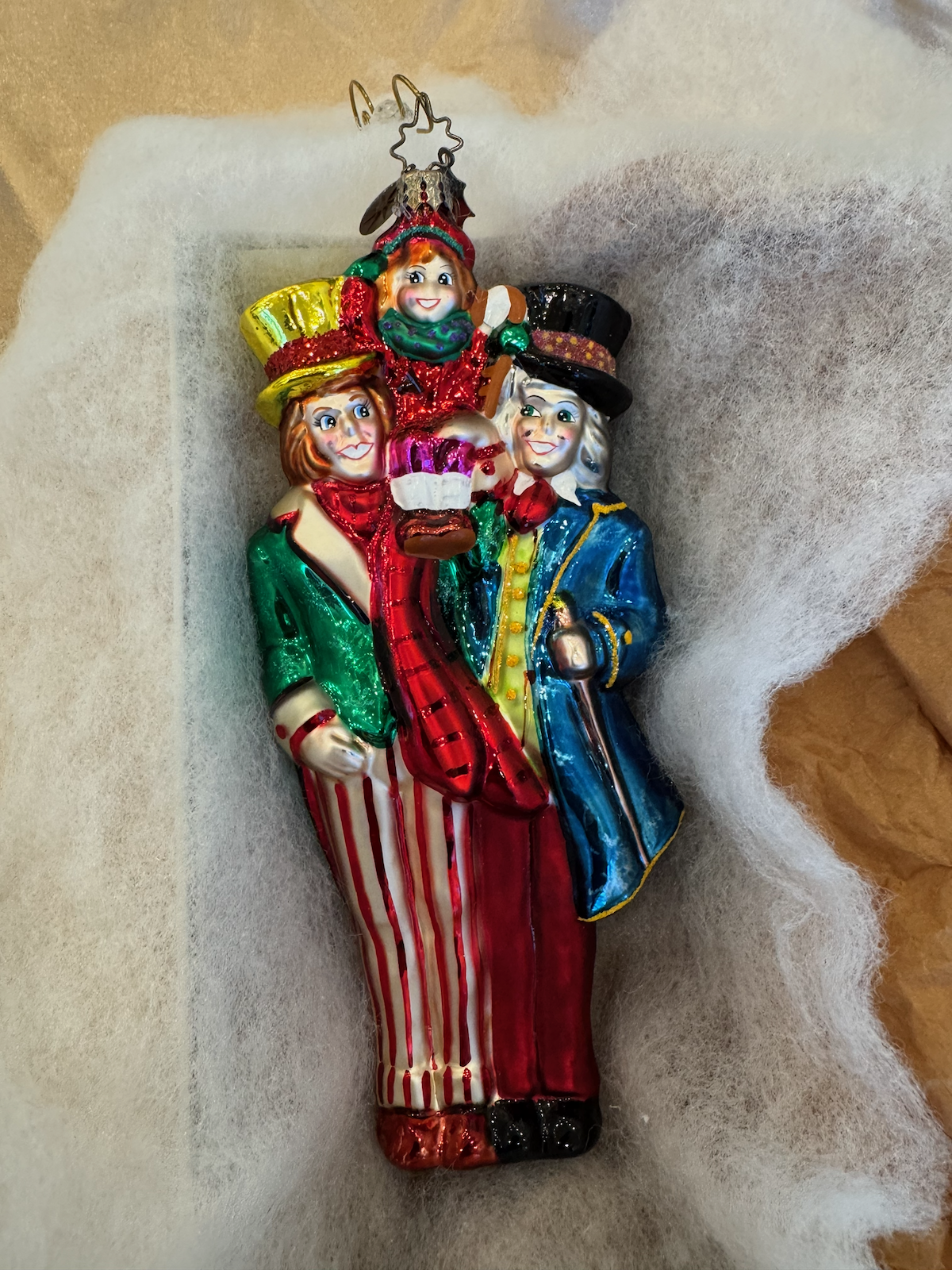 Christopher Radko 2005 “Bless Us, Every One” blown glass ornament from the A Christmas Carol Series. The ornament depicts three Victorian-era carolers standing together — a woman in a green coat, a figure in red, and a gentleman in a blue coat with a top hat. They appear to be singing together, capturing the spirit of Christmas fellowship. Limited to 10,000 pieces.