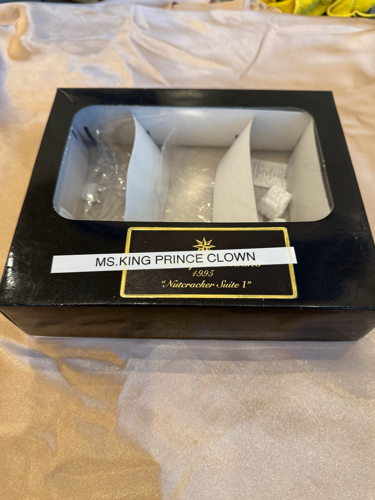 Christopher Radko 1995 “Nutcracker Suite I” blown glass ornament set featuring the Mouse King, Prince, and Clown (labeled “MS.KING PRINCE CLOWN” on box). The set includes: a Prince figure in teal and blue with a golden crown, and a Mouse King figure in ornate colorful regal attire with a crown. The box label reads “Nutcracker Suite I” from 1995. All are hand-painted blown glass with glitter accents.