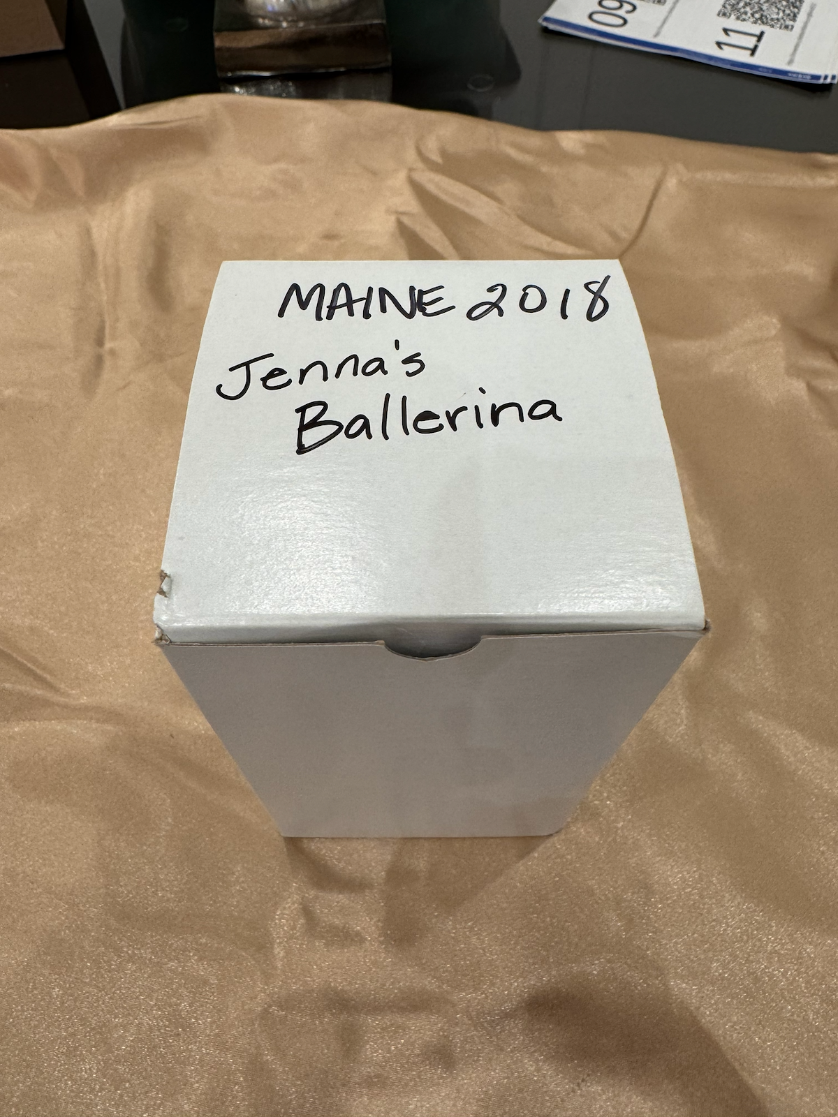 A souvenir ornament purchased in Maine in 2018, associated with Jenna. The ballerina theme reflects a personal connection to dance.