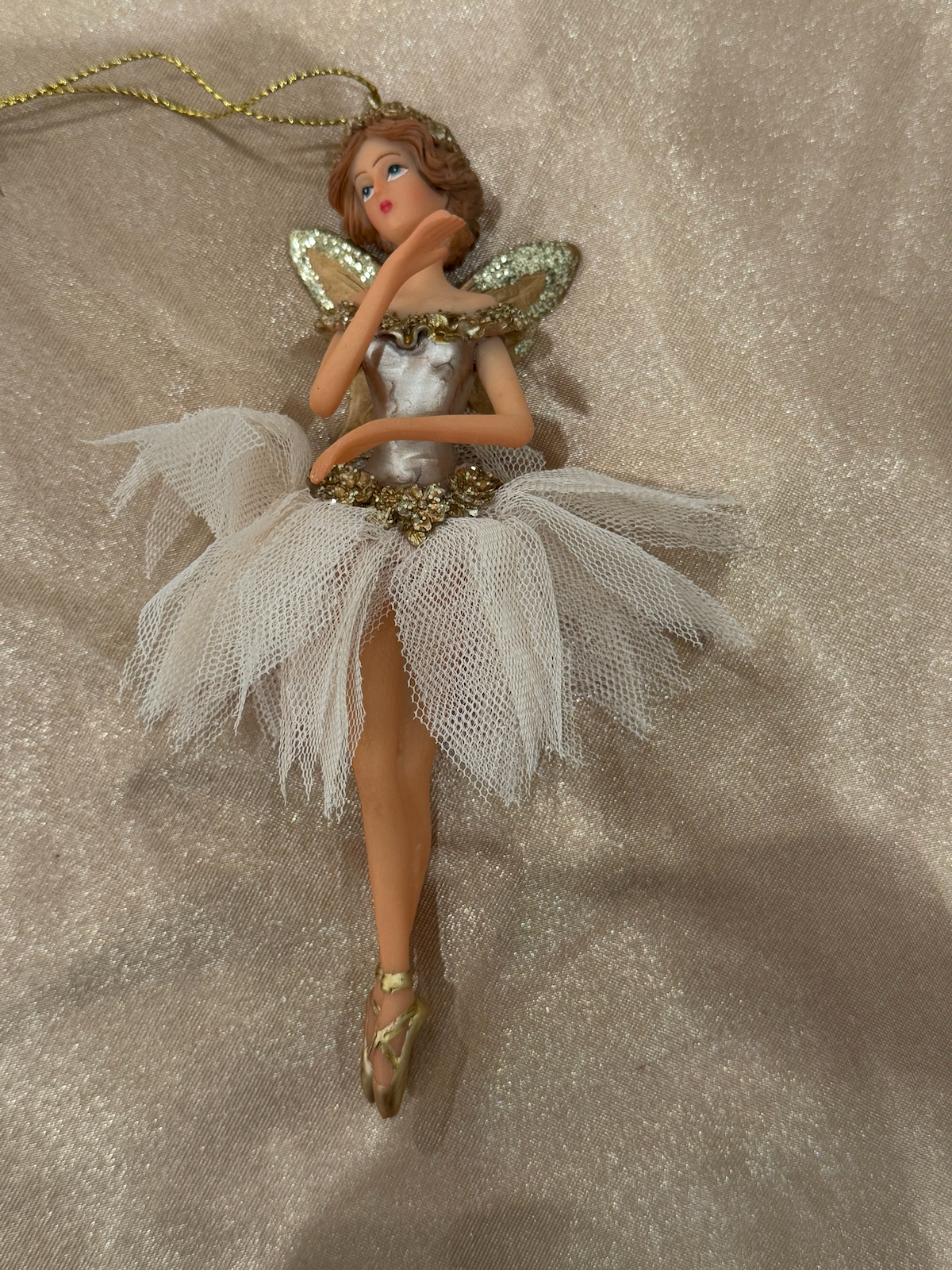 A delicate ballerina fairy ornament featuring a figure in a white tutu with gold glitter accents and small golden wings. The ballerina has auburn hair and is posed in a graceful sitting position with one hand to her face. She wears pointe shoes and her tutu is made of real tulle netting with sparkle details. Box is labeled “MAINE 2018 Jenna’s Ballerina.”