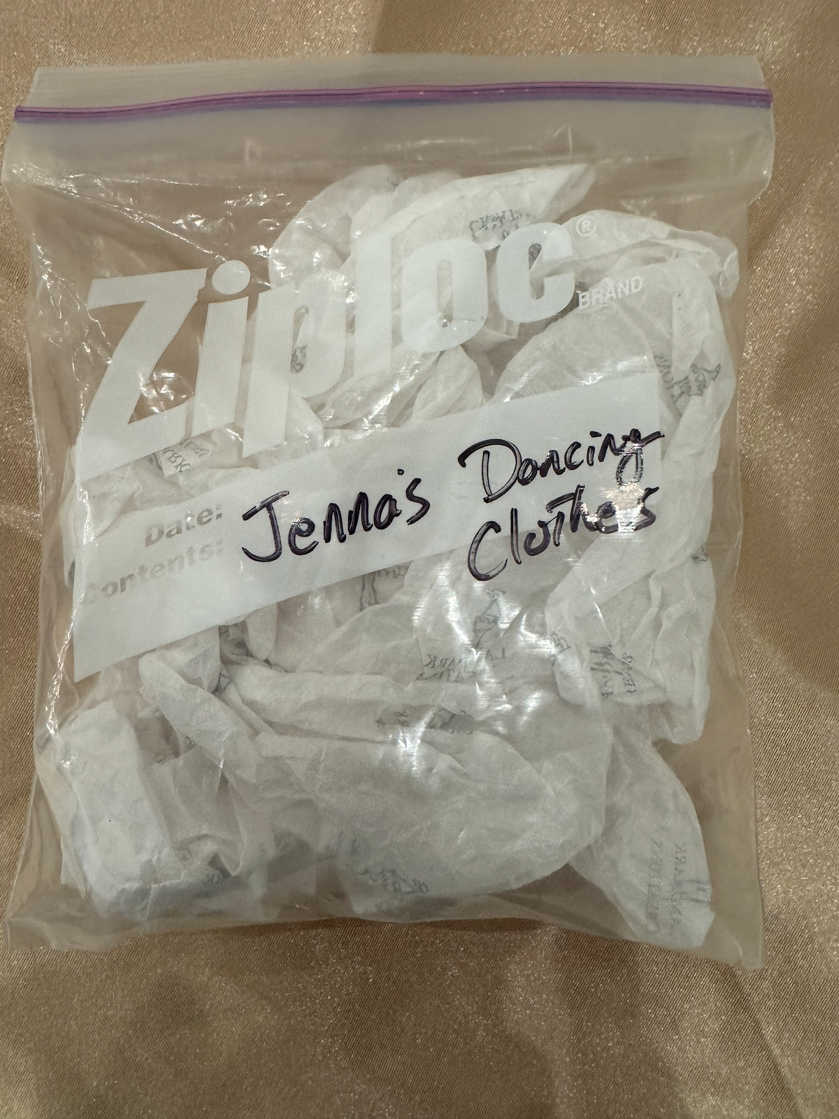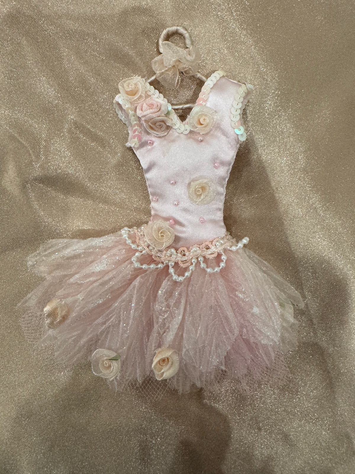 A miniature ballet tutu dress ornament in soft pink and white with delicate fabric roses, pearl-like beads, and tulle netting. The ornament is shaped like a tiny dress on a hanger, featuring a satin bodice adorned with small rosettes and a fluffy tulle skirt. Stored in a Ziploc bag labeled “Jenna’s Dancing Clothes.”