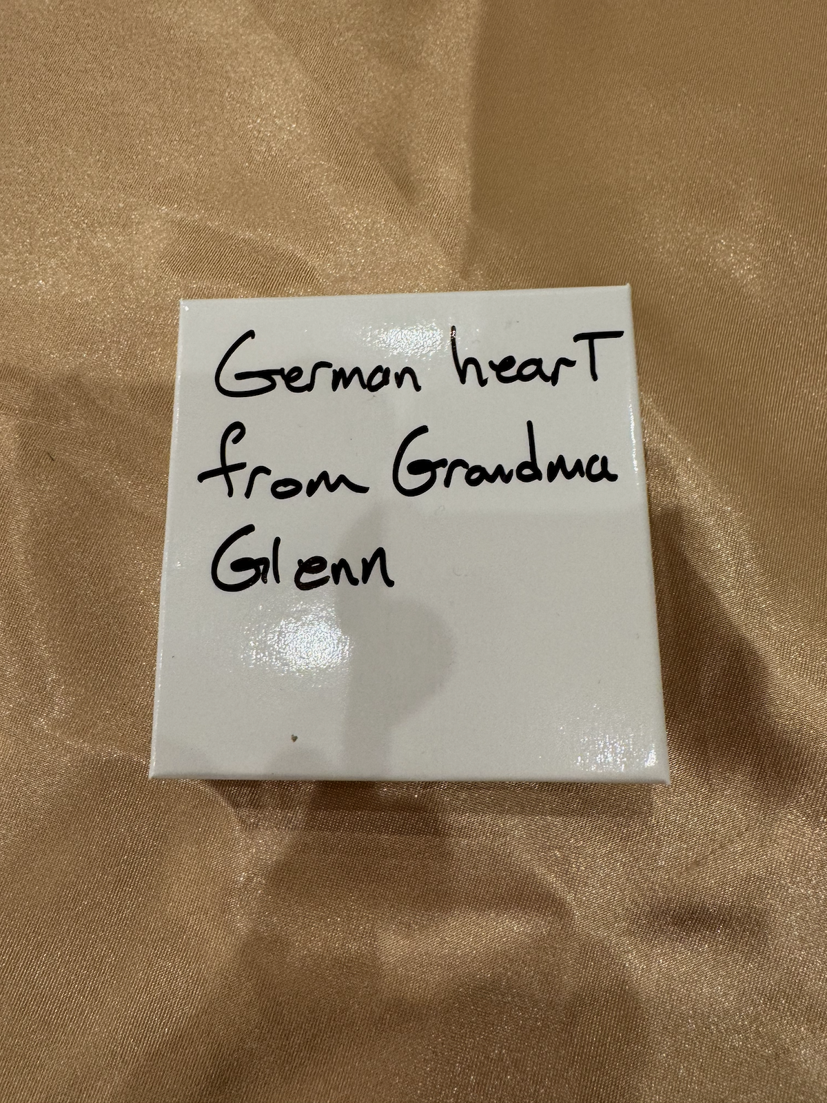 A German heart ornament, a family keepsake from Grandma Glenn. The item is stored in a small white box with a handwritten label reading “German heart from Grandma Glenn.” The ornament itself was not photographed outside the box.