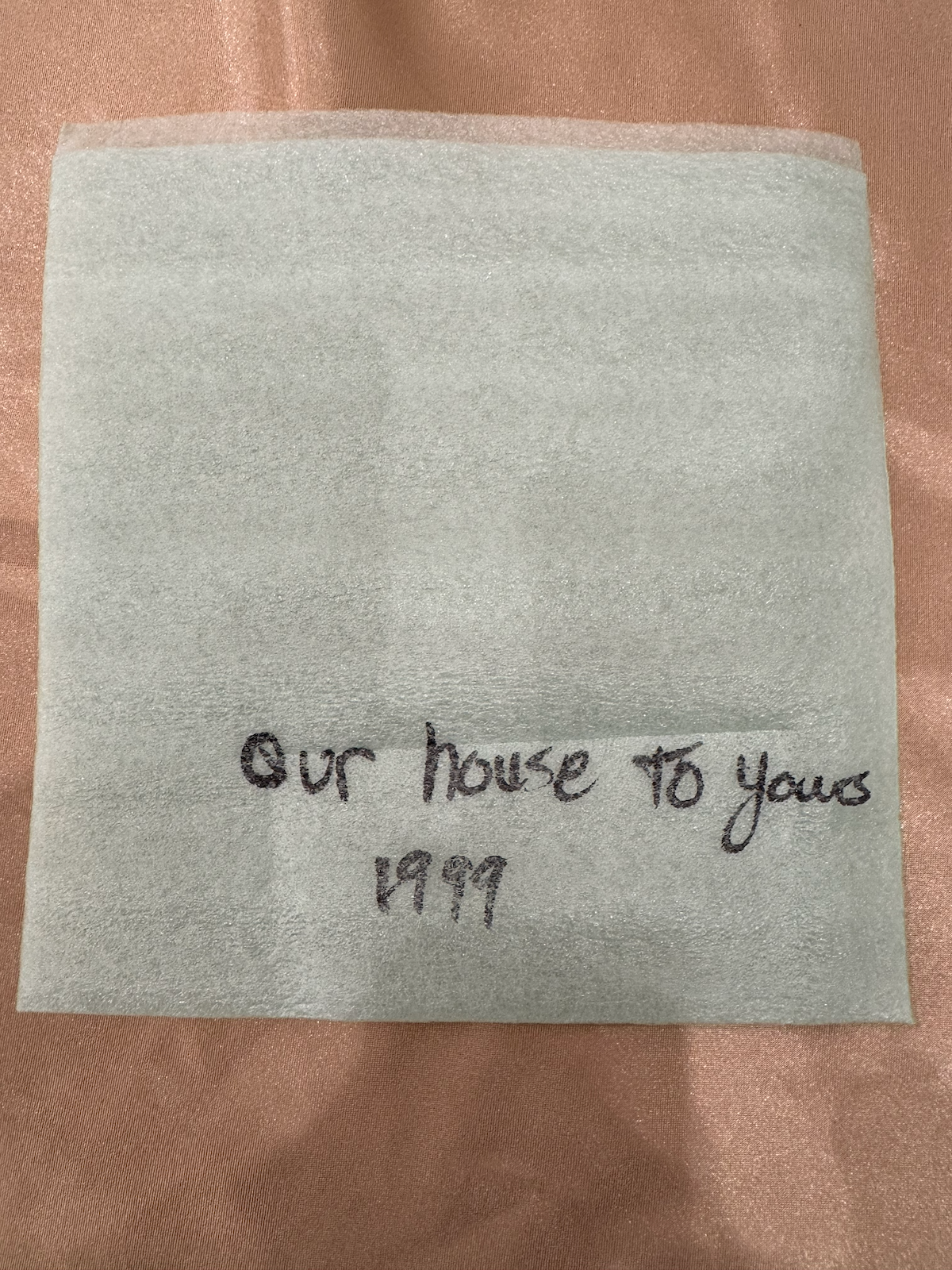 The tissue paper wrapper is labeled “Our house to yours 1999,” confirming this is a personalized holiday keepsake from that year.