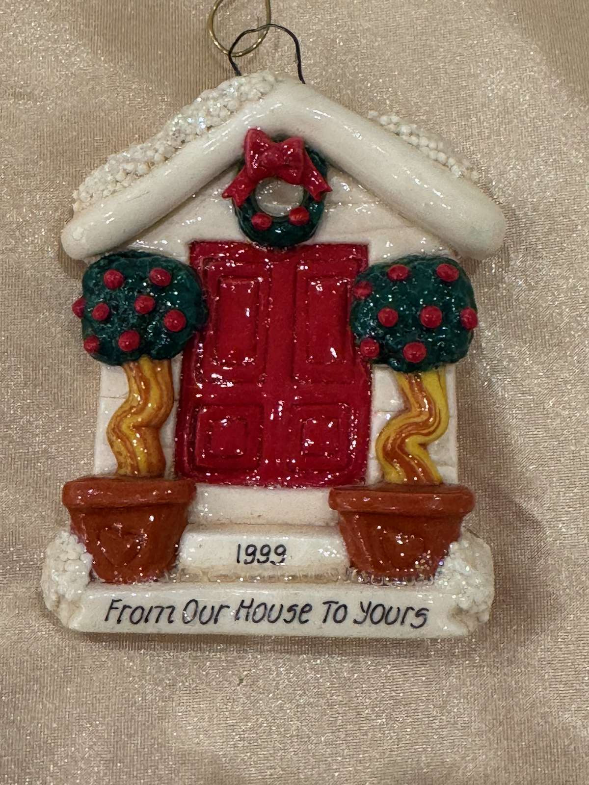 A ceramic house-shaped Christmas ornament featuring a red front door with a green wreath, flanked by two topiary trees in brown pots. The roof is white with snow-like texture, and the base reads “From Our House To Yours” with the year 1999. The ornament has a gold wire hanger at the top.