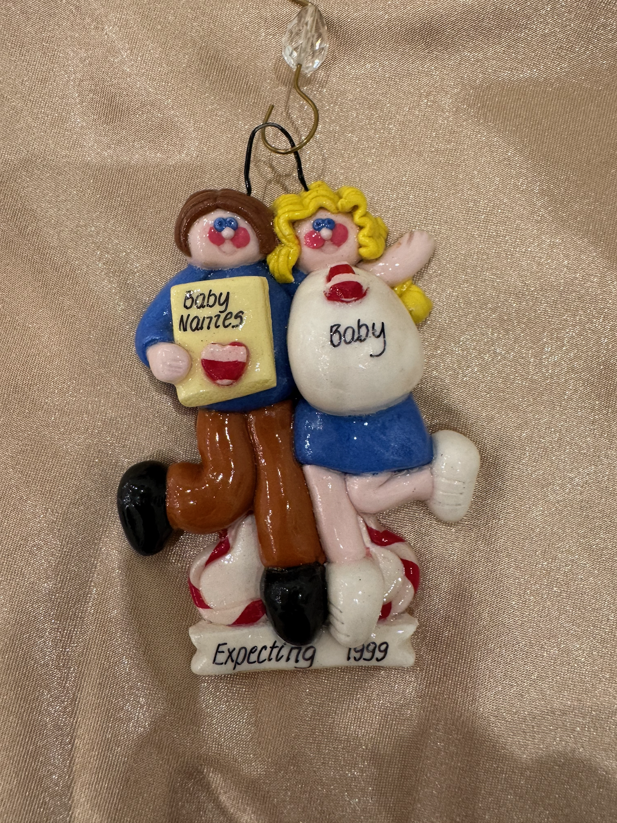 A colorful polymer clay ornament depicting an expecting couple. The man has brown hair and holds a “Baby Names” book, while the blonde woman wears a blue dress with “Baby” written on her pregnant belly. They stand together on a base that reads “Expecting 1999.” The ornament has a crystal bead accent at the top of the hanger.