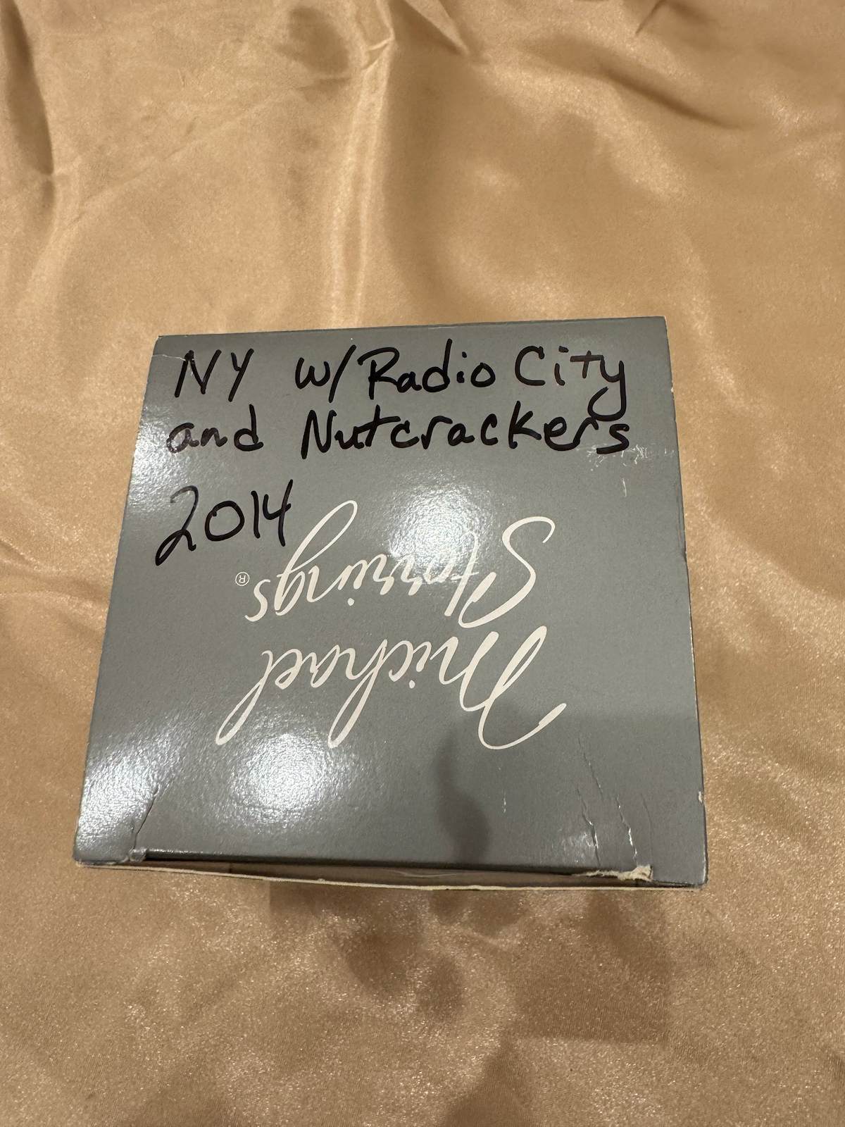 A boxed ornament from Michael Storrings (visible upside-down logo on the box). The gray/silver box is labeled in handwriting “NY w/ Radio City and Nutcrackers 2014.” The ornament inside is not visible in this single photo as only the box exterior is shown.