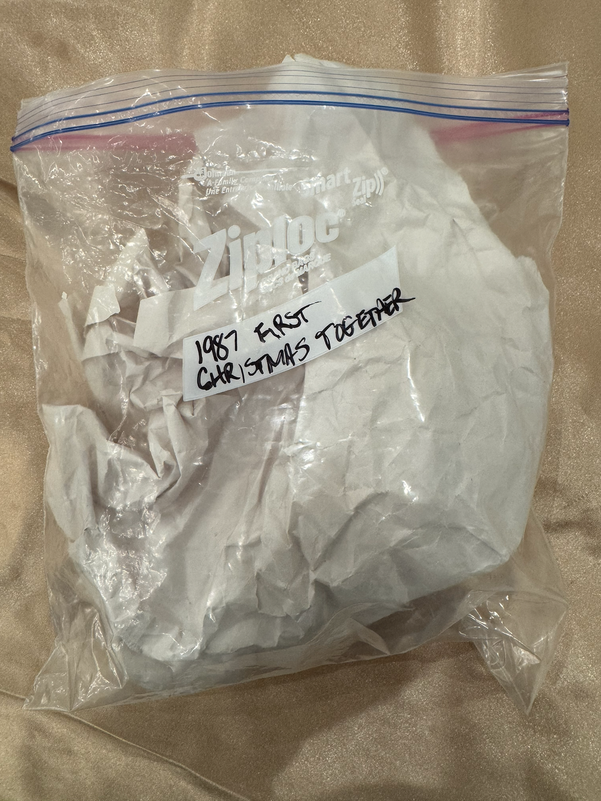 An ornament stored in a Ziploc bag with tissue paper wrapping. The bag is labeled “1987 FIRST CHRISTMAS TOGETHER” in handwritten block letters. The ornament itself is not visible through the wrapping.