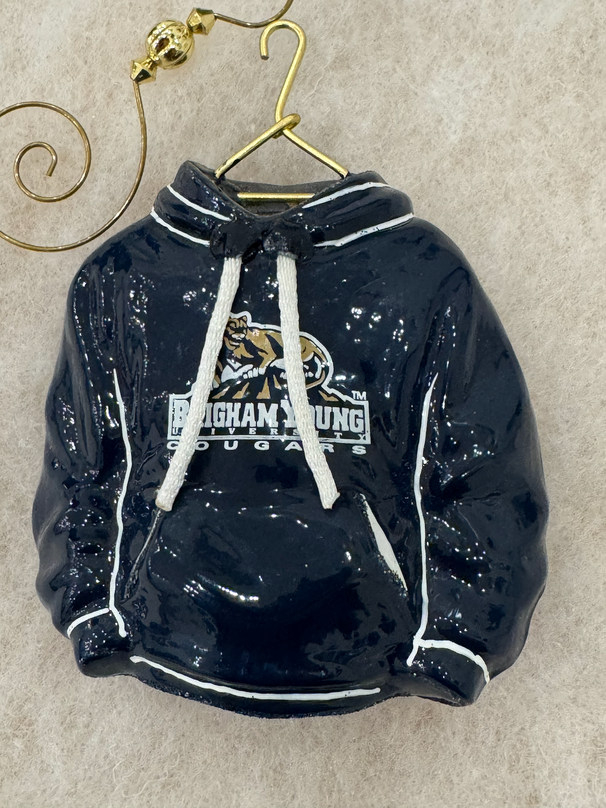 A glass ornament in the shape of a navy blue BYU (Brigham Young University) Cougars hoodie sweatshirt, hanging from a miniature gold wire hanger. The hoodie features the Brigham Young University Cougars logo with the cougar mascot on the front. It has white drawstrings, white trim on the cuffs and hem, and detailed texture. Made by Joy to the World Collectibles (model ZKP2590BYU), it comes in a black presentation box.