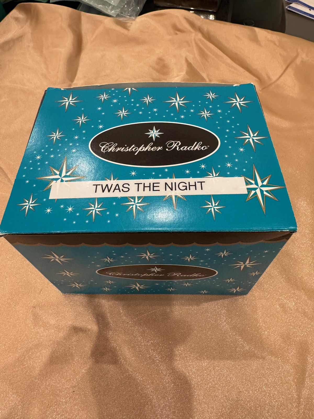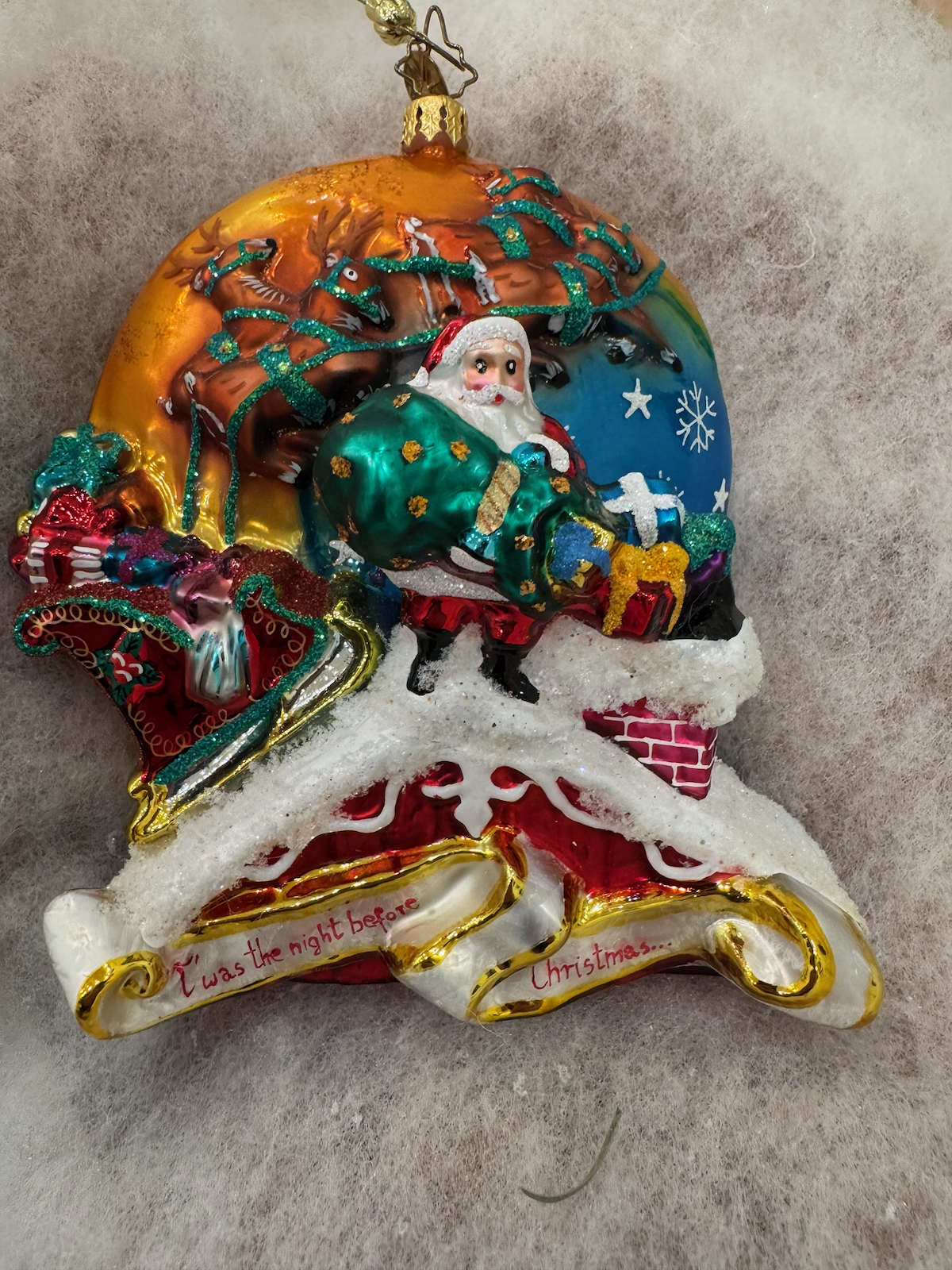 Stored in its original teal/turquoise Christopher Radko box labeled “TWAS THE NIGHT.” This is a highly detailed collector piece depicting the classic Christmas poem scene.
