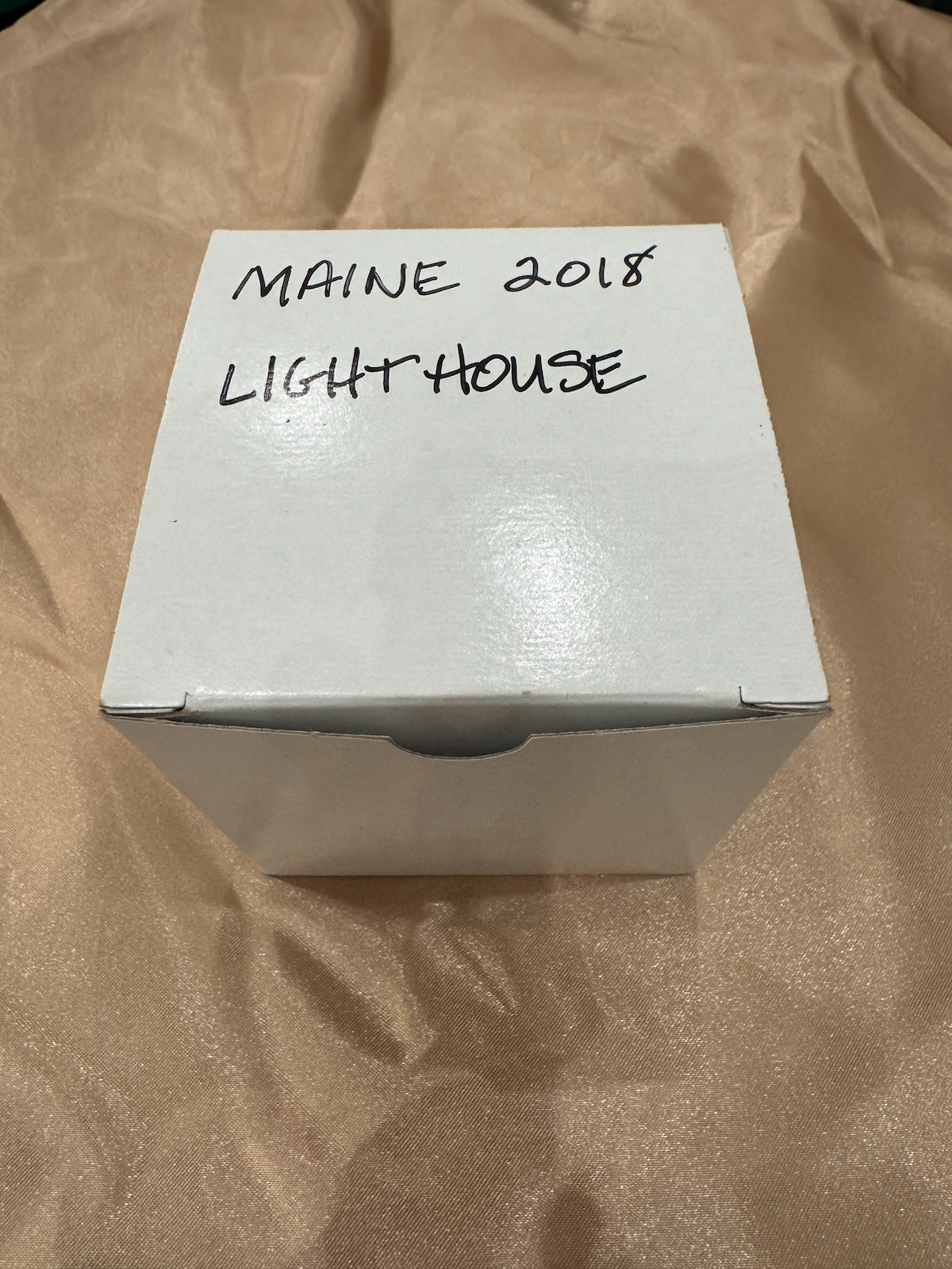Souvenir from a 2018 trip to Maine. The box is labeled “MAINE 2018 LIGHTHOUSE.” The painting appears to depict a classic New England lighthouse, possibly Nubble Light or a similar iconic Maine lighthouse.