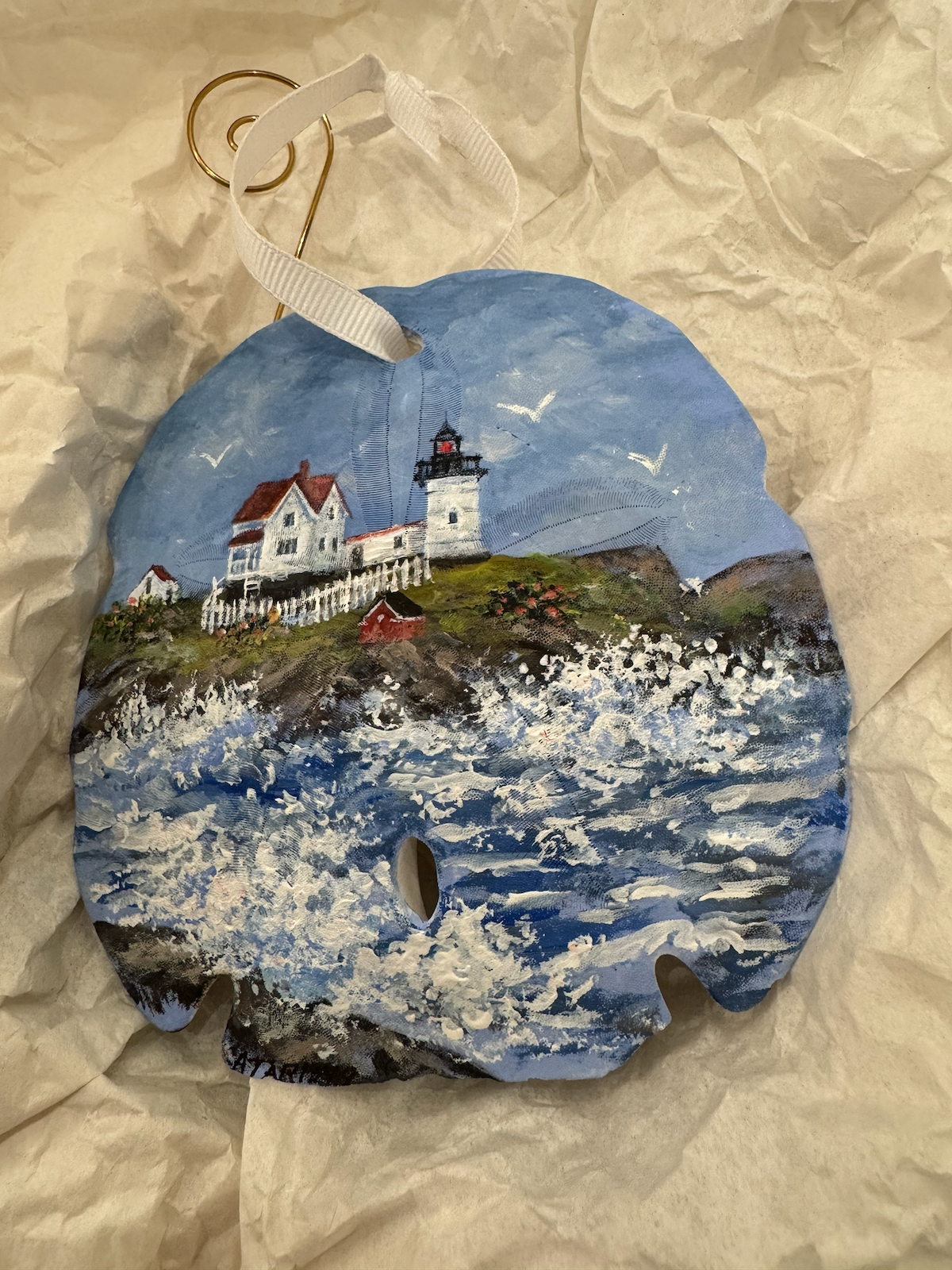 A hand-painted sand dollar ornament depicting a Maine lighthouse scene. The natural sand dollar has been painted with a coastal landscape showing a white lighthouse with a red-roofed keeper’s house perched on a rocky cliff above crashing ocean waves. Seagulls fly in the blue sky above. The ornament hangs from a white ribbon with a gold wire hook.