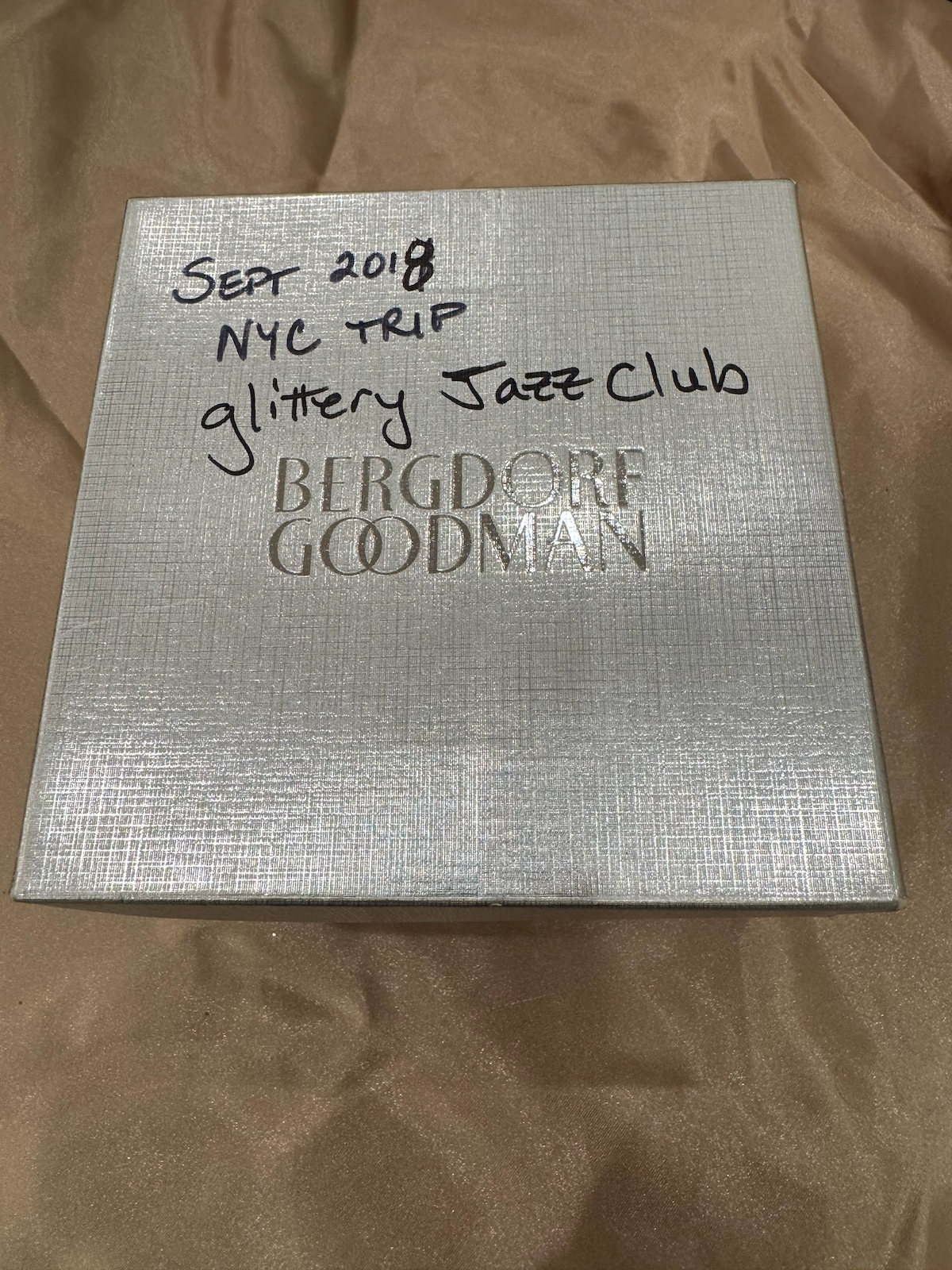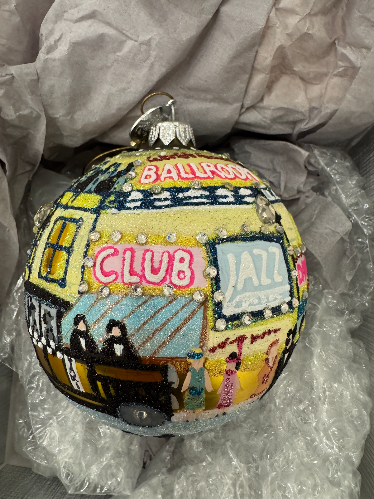 Purchased at Bergdorf Goodman during a September 2018 NYC trip. The silver Bergdorf Goodman box is hand-labeled “Sept 2018 NYC TRIP glittery Jazz Club.” This is a high-end department store ornament capturing the glamour of New York City nightlife.