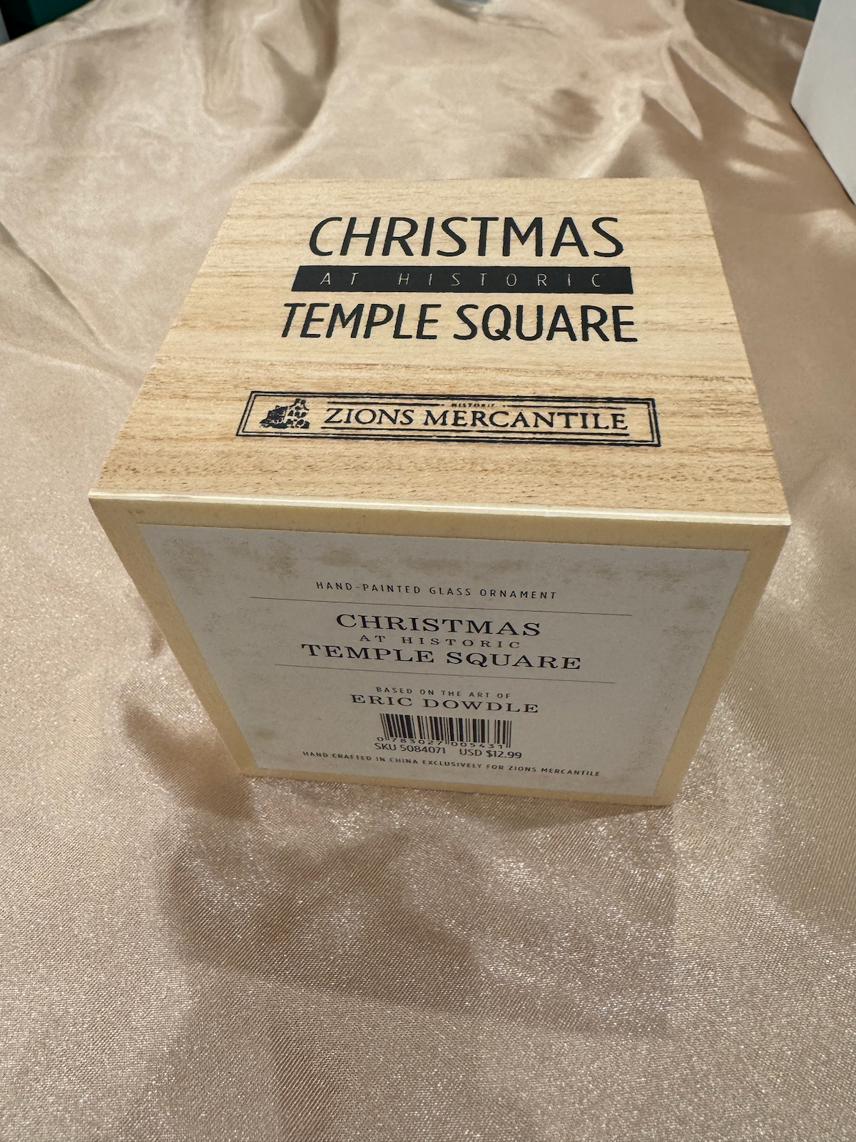 Stored in its original wooden box from Zions Mercantile, labeled “Christmas at Historic Temple Square.” The ornament is described as a “Hand-Painted Glass Ornament” based on the art of Eric Dowdle. This appears to be a companion piece to item-0107 (the Landmark Creations SLC Temple ornament), both commemorating visits to Salt Lake City.