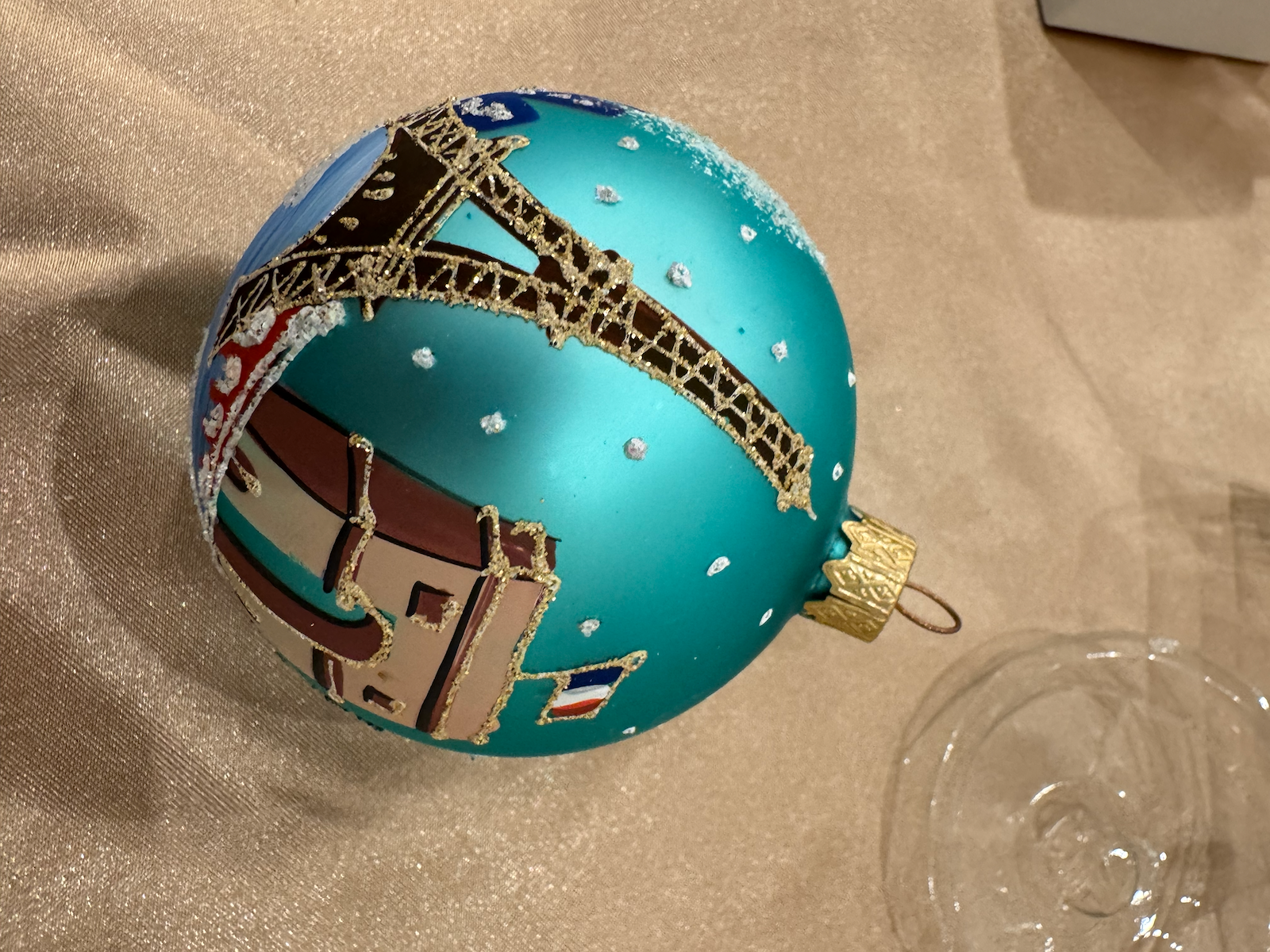 A blown glass ornament depicting Santa Claus emerging from a chimney. Santa is shown from the waist up, wearing his traditional red suit and hat with white fur trim, holding green mittens to his face in a playful “shushing” gesture. He is dusted with sparkling white glitter to suggest snow. The chimney base is painted in a warm gold/copper color. The ornament hangs from a gold string attached to the top of Santa’s hat.