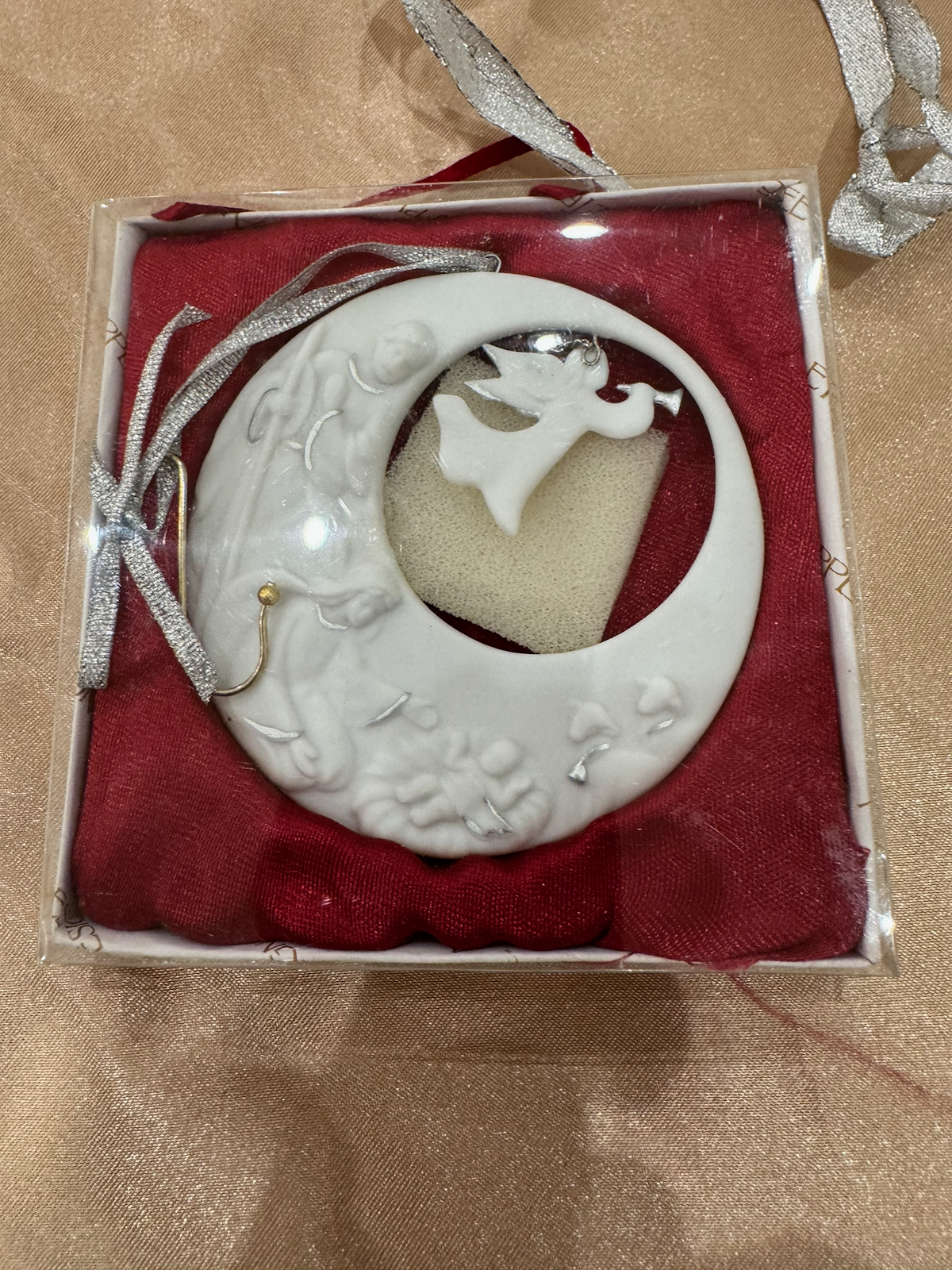 This appears to be a fine porcelain or bisque ornament. No maker or date information is visible. It has only a single photo showing the ornament in its display packaging.